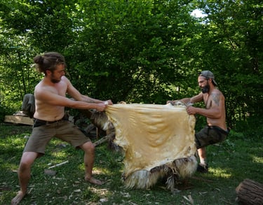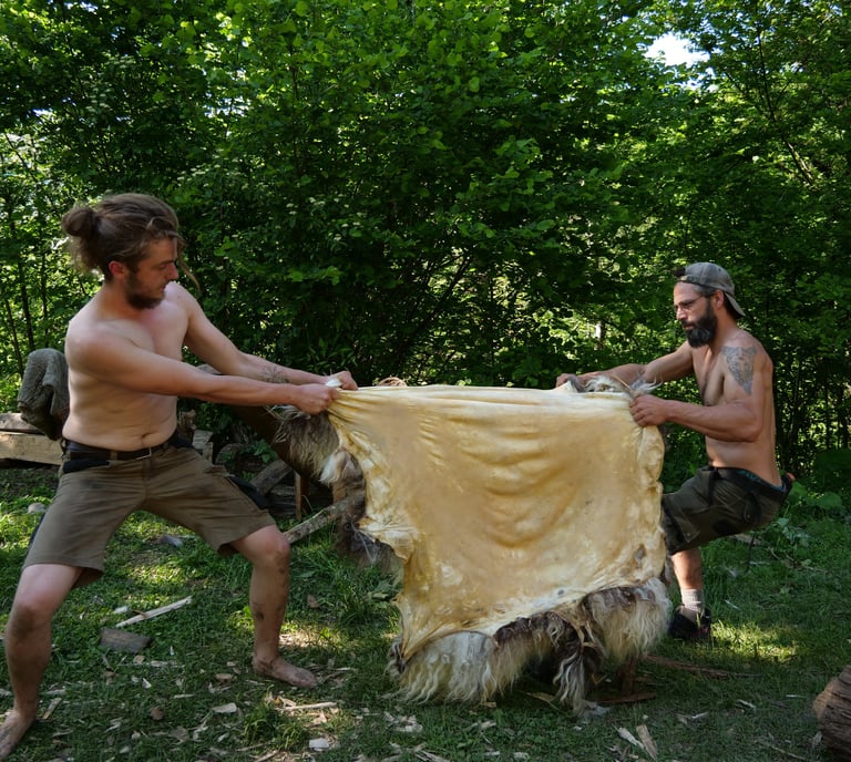 Trois jours de travail pour transformer un peau crue en cuir où fourrure tanné. Nous utiliserons les techniques traditionnelles de tannage issues des peuples chasseurs-ceuilleurs, le tannage au gras et à la fumée. Nous vivrons cette aventure sur un camp, avec cuisine au feu de bois et nuits en tipi. Une immersion dans les gestes premiers et les savoirs anciens, dans une ambiance conviviale et chaleureuse.